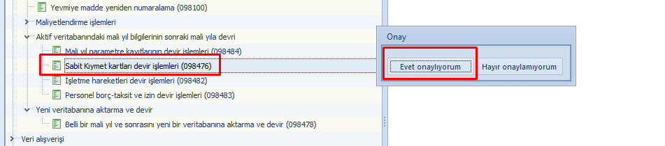 • Eski mali yılda sabit kıymet alım-satım işlemleri sonuçlandıktan sonra, sabit Kıymet kartları devir işlemleri (098476) programı çalıştırılarak Sabit kıymet kartlarının yeni yıla devri gerçekleştirilmeli.