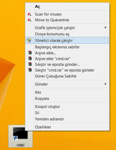 Yönetici olarak Dos komut penceresi açmak için Dos komut satırının üstünde farenin sağ tuşuna basıp “yönetici olarak çalıştır” ı seçiniz.