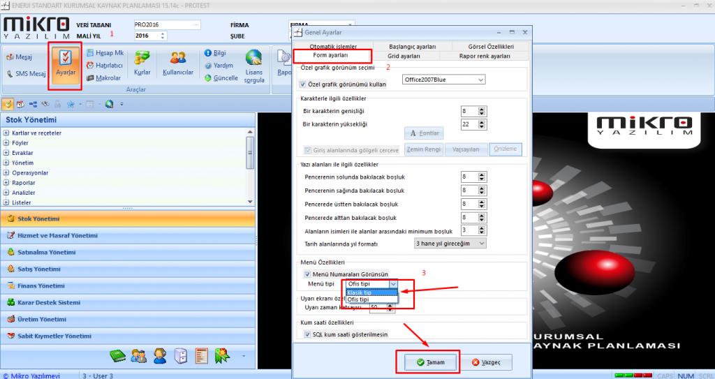 Form Ayarları sekmesinde bulunan “Menü Tipi” seçeneğini “Klasik Tip” olarak seçili hale getiriyoruz