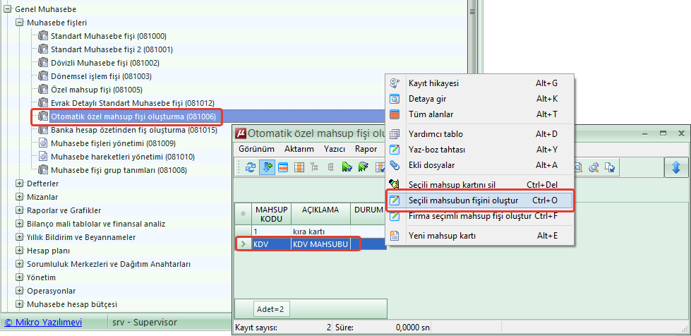 2. Bir uygulama olarak Otomatik özel mahsup fişi oluşturma 081006 menüsünde Özel mahsup kodunu seçip operasyon menüsünden yada üzerinde sağ tık Seçili mahsubun fişini oluşturabilirsiniz.