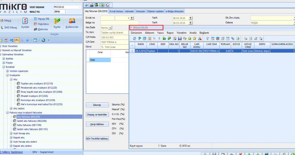 “Evraklar -> Fatura ve İrsalieli Faturalar – Alış faturası  (062205)” Evrak menüsüne giriş yapıp irsaliyesini girdiğimiz siparişin fatura girişini de yapmamız gerekmektedir.